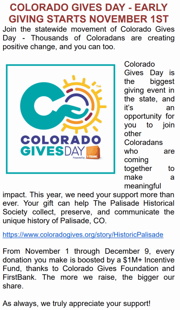 The Palisade Historical Society is dedicated to collecting, preserving, and communicating the unique history of this small, Western Colorado town which was settled in the 1890s and incorporated in 1904.Â