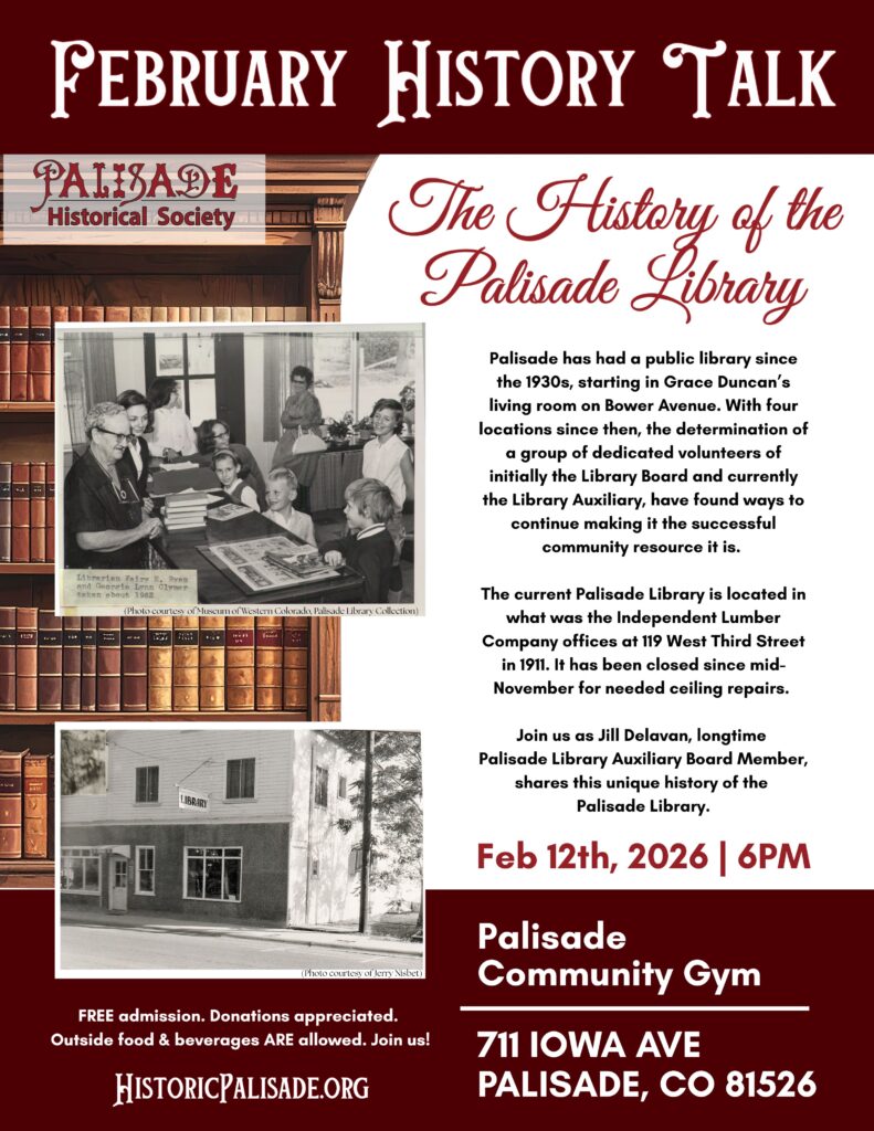 The talk will begin at 6:00 p.m. on Thursday, February 12th at The Palisade Community Gym at 711 Iowa Avenue! This program is open to the public in a relaxed and comfortable setting for people to learn about Palisade’s unique history. There is no admission, but donations are appreciated. Food and beverages WILL BE ALLOWED on site, so feel free to bring your own! Come early to socialize & grab a seat!
