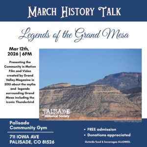 SAVE THE DATE! March’s History Talk is Legends of the Grand Mesa, the Community in Motion Film and Video created by Grand Valley Magazine in 2015 about the myths and legends surrounding Grand Mesa including the iconic Thunderbird. The Palisade Historical Society’s Monthly History Talks are the second Thursday of the month at the historic Palisade Gymnasium/Auditorium, known as the Palisade Community Gym, at 711 Iowa Avenue. The talk will begin at 6 p.m. on Thursday, March 12th at the Palisade Community Gym, but feel free to come early to socialize! This program is open to the public to learn more about Palisade’s unique history in a relaxed environment. No reservations are needed. Admission is free, and donations are appreciated. As food and beverages will not be available for purchase on site, people can bring their own to the program. We hope to see you there!