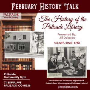The talk will begin at 6 p.m. on Thursday, February 12th at the Palisade Community Gym, but feel free to come early to socialize! This program is open to the public to learn more about Palisade’s unique history in a relaxed environment. No reservations are needed. Admission is free, and donations are appreciated. As food and beverages will not be available for purchase on site, people can bring their own to the program.